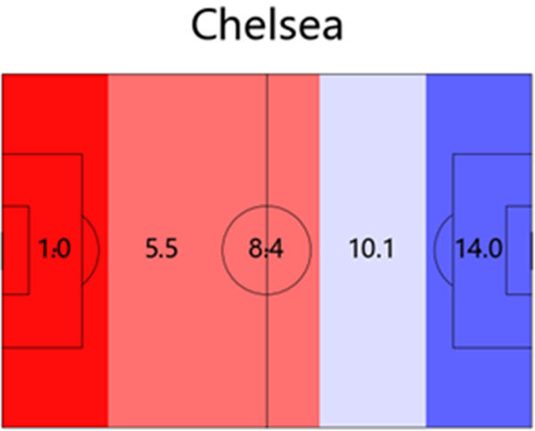 Показатель PPDA "Челси" тоже характерный — в верхних 40% поля результат выше (то есть менее интенсивно) медианы по лиге