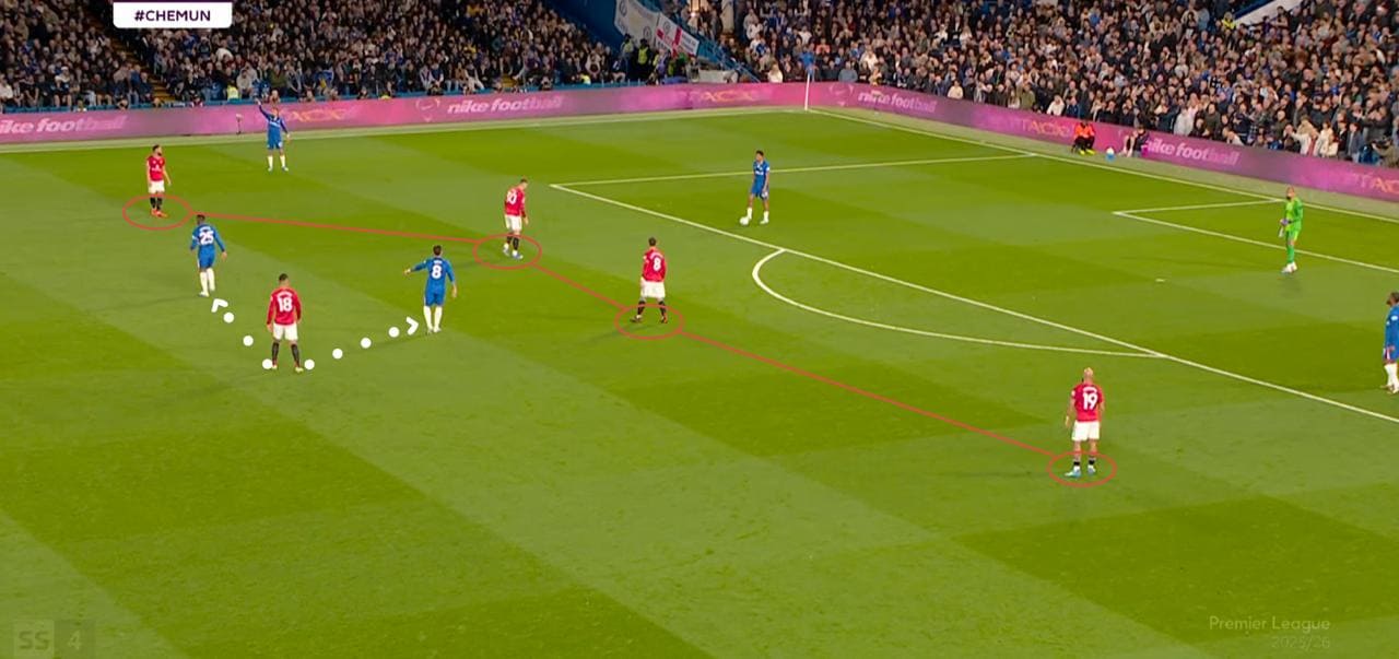 Ситуативная игра с тройкой сзади (Шоу оставался глубже) помогала "МЮ" справиться, но второй темп тоже потенциально был скрытой угрозой обороне манчестерцев — они совершили несколько "опасных" для своих ворот фолов и отборов в считанных метрах от линии штрафной. Почти все моменты "Челси" возникли после передач из центральной зоны в правый полуфланг. И все-таки манкунианцы справлялись до перерыва, пусть и были уязвимы в пространстве перед собственной штрафной — при всех попытках перекрыть центр невозможно сдерживать атаки оппонентов со столь подвижными флангами.