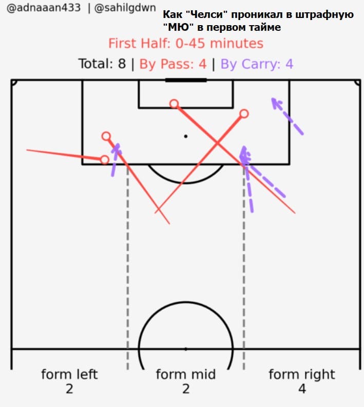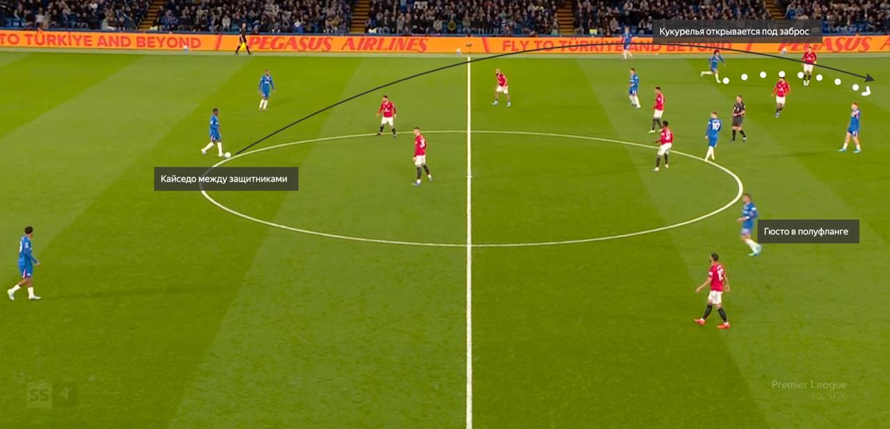 "МЮ" делал все, чтобы вытеснить владения соперника на края. Конечно, там "Челси" пытался сдваивать левый фланг через ротации Кукурельи и вингера (Нету изначально), затрудняя оборону Далоту. Вытягивания футболистов в красном из их зон стало одним из основных инструментов для хозяев при попытках войти в финальную треть. Каземиро не всегда успевал вернуться, Майну часто приходилось смещаться на фланги, и Палмер пользовался этим — весь "Челси" пользовался этим. Кукурелья чаще остальных пасовал в зону 14 перед штрафной "Юнайтед", а "десятка" хозяев был основным адресатом таких передач.