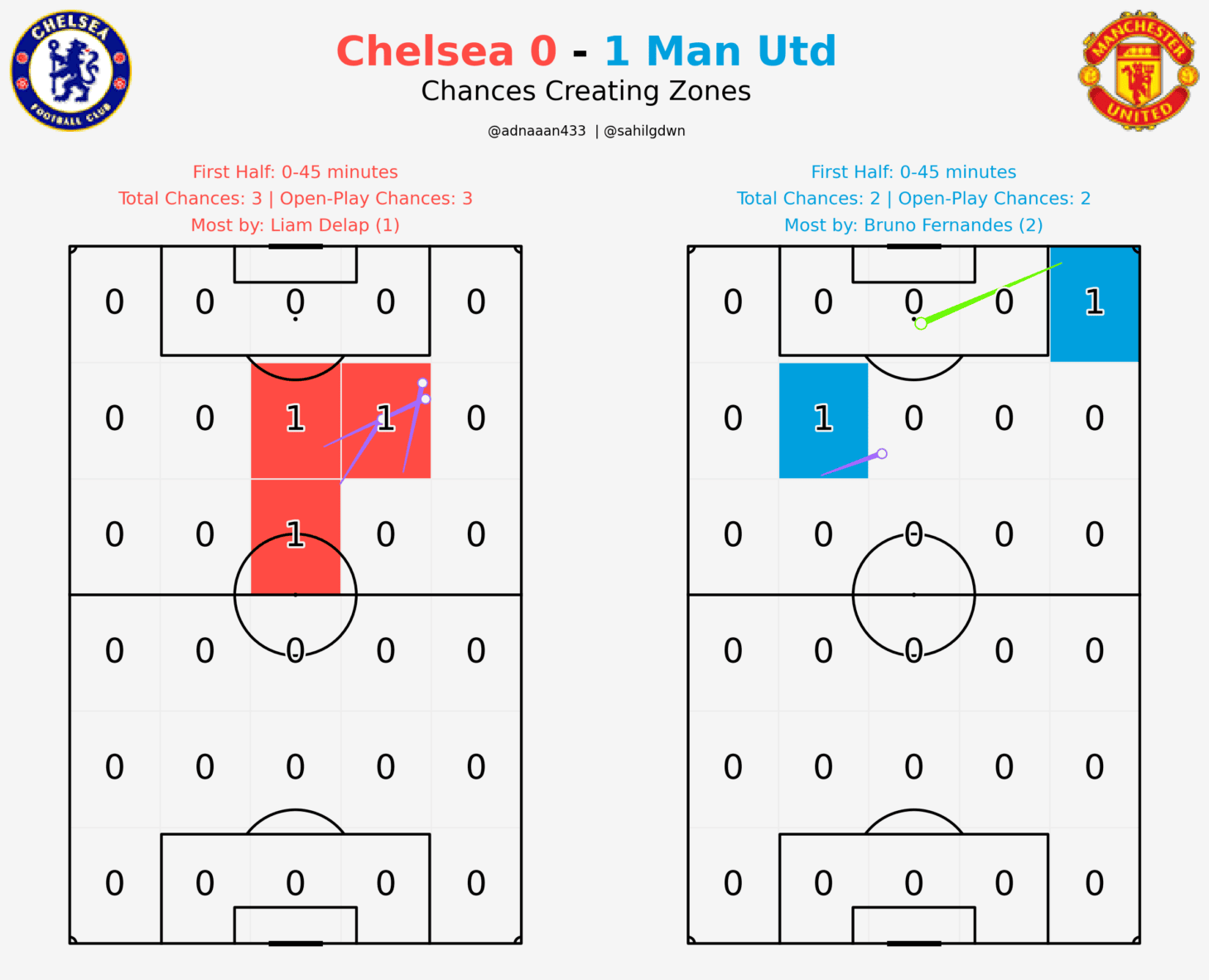 "МЮ" сделал примерно то, что показывали "синие" при владениях — фланговые ротации, вытягивания крайних (реже — центральных) защитников из их зон. Лондонцам воплотить такие ситуации в гол не удалось. У "МЮ" в составе просто был человек, способный сделать это. Редкое появление Бруно на правом фланге немного смутило защиту. Мбемо вытащил Кукурелью выше из линии, чем помог Фернандешу, Шешко связал Кайседо, Кунья открылся под прострел вторым темпом без помех. Первый (и единственный вообще в матче у гостей) удар в створ в концовке тайма = гол. Примечательно, что сразу после перерыва манчестерцы попытались повторить, но пас Бруно не прошел.