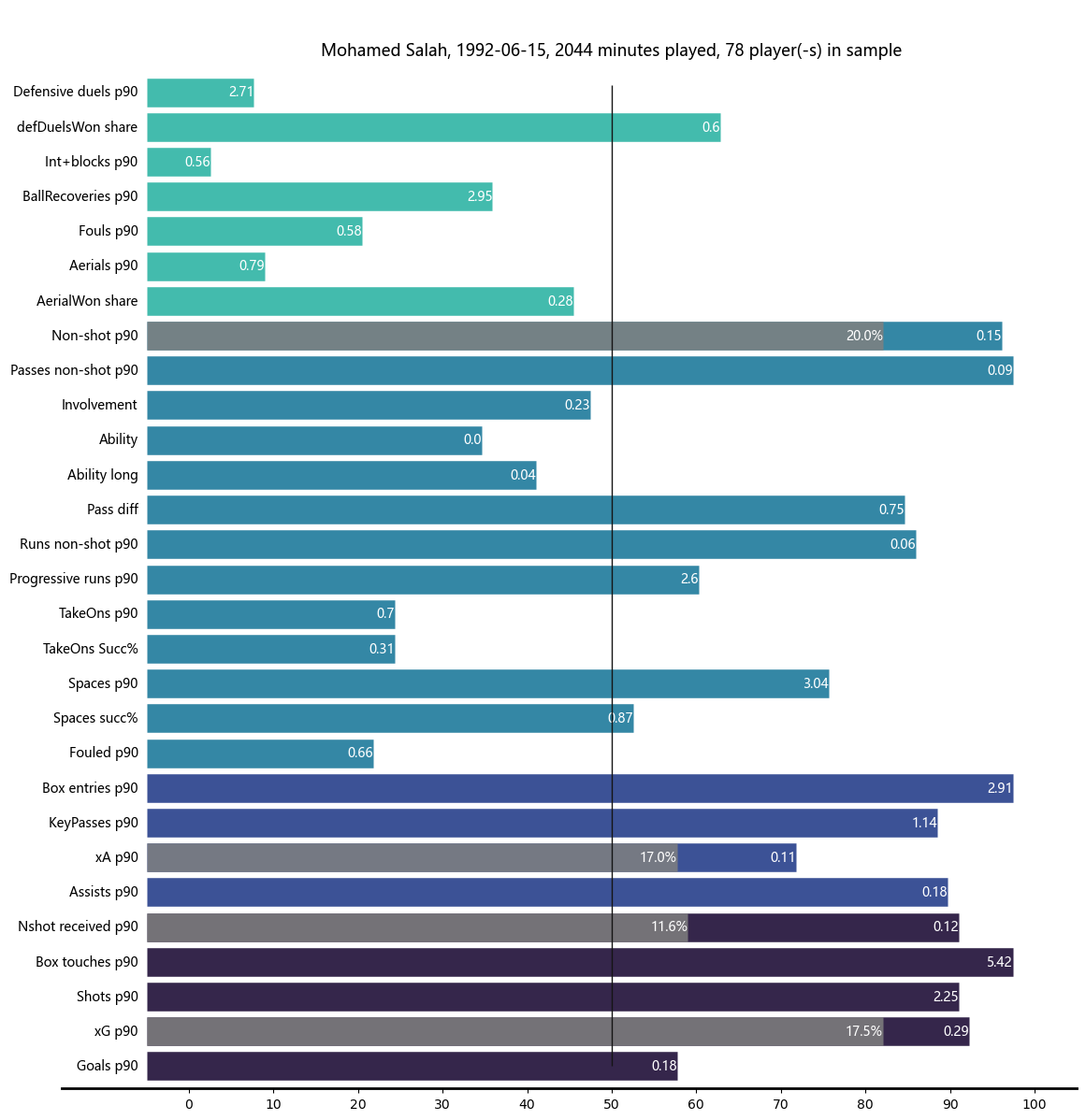 "Спонсорами" в первом случае были главным образом качества лидеров "Сити" — Холанда и Семеньо, в частности. В детали второго условия добавлялась пассивность атакующей группы и, в частности, Салаха. Египтянин в этом сезоне имеет менее трех (с учетом корректировки под объем владения мячом, padj) оборонительных дуэлей внизу — мало относительно его собственных стандартов, не говоря уже о лиге в целом, где он входит в 8% худших по данному показателю.