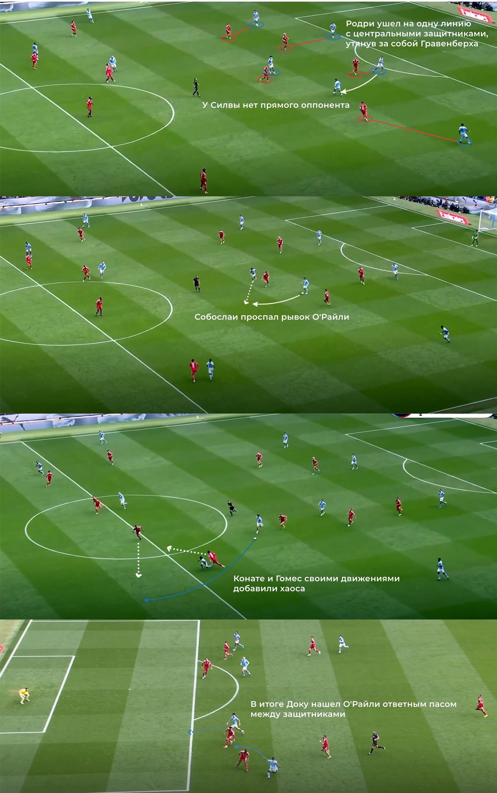 Лучшим олицетворением сказанного стал четвертый гол "Сити", момент с которым можно описать как "атака на пространстве", но как такового перехода там не было: "Ливерпуль" поднялся в высокий блок, верхняя пятерка (Экитике, Салах, Гравенберх, Виртц, Собослаи) "персоналит" пятерых игроков "Сити" в билдапе (Гравенберх оказывается высоко, так как шел за Родри, который опустился на одну линию с центральными защитниками), но не может среагировать на открывание Бернарду Силвы.