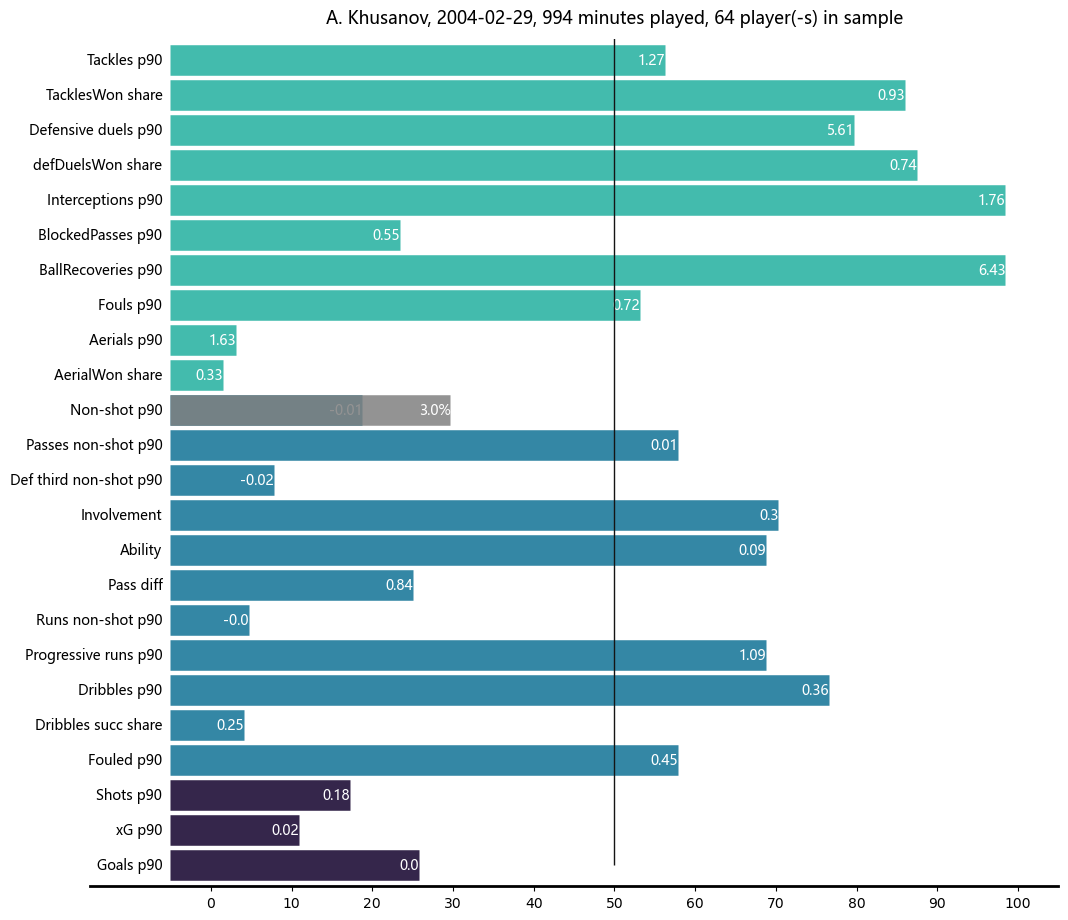 В гипотетическом сценарии, где он играет внешнего центрального защитника в тройке, перечисленные выше факторы не были бы столь большой проблемой, но его явно блокирует влияние на игру через владения: даже играя за "Сити", Хусанов умудряется в абсолюте набирать нон-шот на уровне 20 перцентиля по лиге на своей позиции.