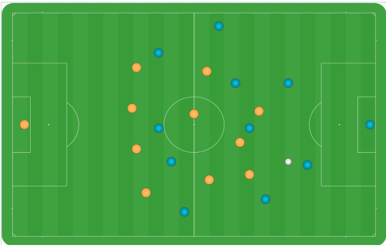 Далее "Брайтон" меняет направление атаки и активно ротируется в четверке Виффер - Рюттер - Минте - Грюда, удается значительно манипулировать расположением Керкеза и Джонса. Ван Дейк по виду в более значительной — хоть и тоже сильно ориентируется на расположение соперника — степени привязан к створу и менее радикально дергался за Грюдой.
