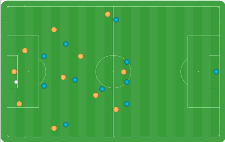 Основной идеей "Ньюкасла" под такую расстановку соперника, когда мяч доводился до вратаря, был либо поиск так называемого coming-short открывания (в направлении партнера с мячом) Вольтемаде, либо доставка в его адрес верхом, но под ситуации, которые с меньшей вероятностью сведутся к единоборству.