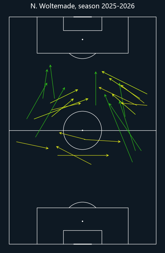 Несмотря на рост под 2 метра и весомое количество ударов (более трети от общего количества) и голов головой, в том числе в этом сезоне, Вольтемаде сложно назвать хорошей опцией под вертикальное продвижение — нет, он не ужасно прыгает в плане тайминга (и банально максимальной высоты), в целом с его антропометрией нет проблем, чтобы достичь мяча в конкретной точке наверху; однако, его достаточно просто теснить корпусом и сбивать с движения еще до самого прыжка.