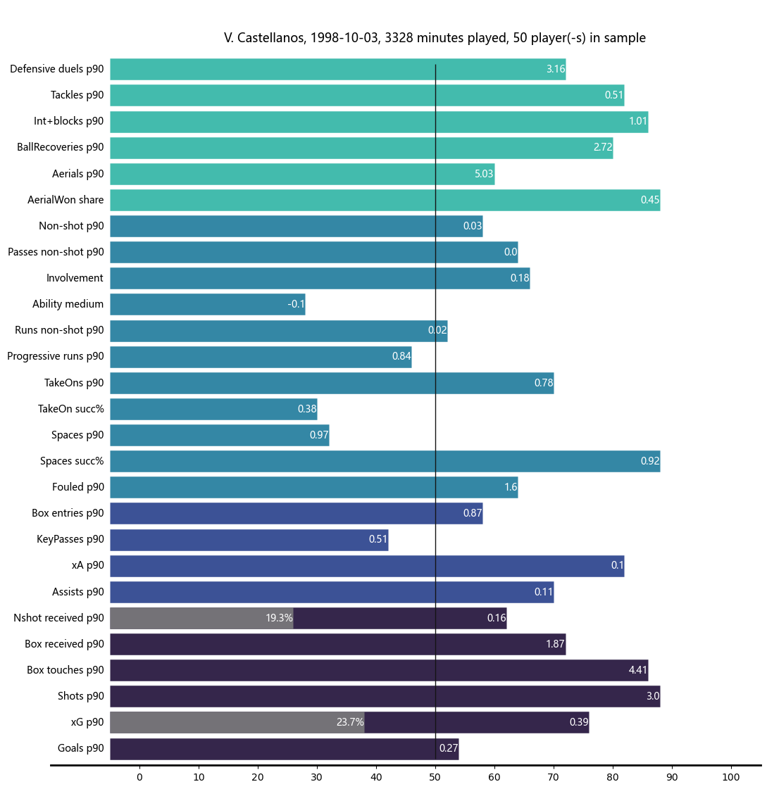 И все же в прошлом сезоне Кастельянос при 2500+ минутах (28 матчей из 29 в "старте") собирал неплохие показатели как с точки зрения качества открываний и итогового числа моментов (0,44 xG на 90 минут), так и по действиям наверху — опять же не противоречит его проблемам при игре "корпус в корпус" и в статусе главной цели при длинных передачах.