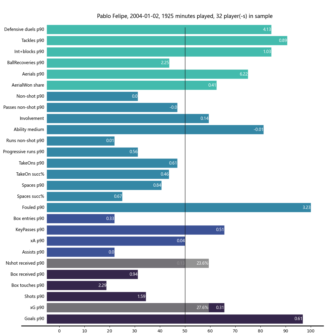 Трансфер Пабло Фелипе за 23 миллиона евро (сумму озвучивают СМИ) вызывает вопросы не только с финансовой точки зрения, но и при беглом взгляде: данные по xG и производным от них метрикам доступны почти каждому — на выборке в полтора сезона за "Жил Висенте" бразилец по голам почти двукратно превзошел ожидаемый объем; однако его статистика даже по такому количеству моментов не подкрепляется с точки зрения количества/качества открываний в опасных зонах.