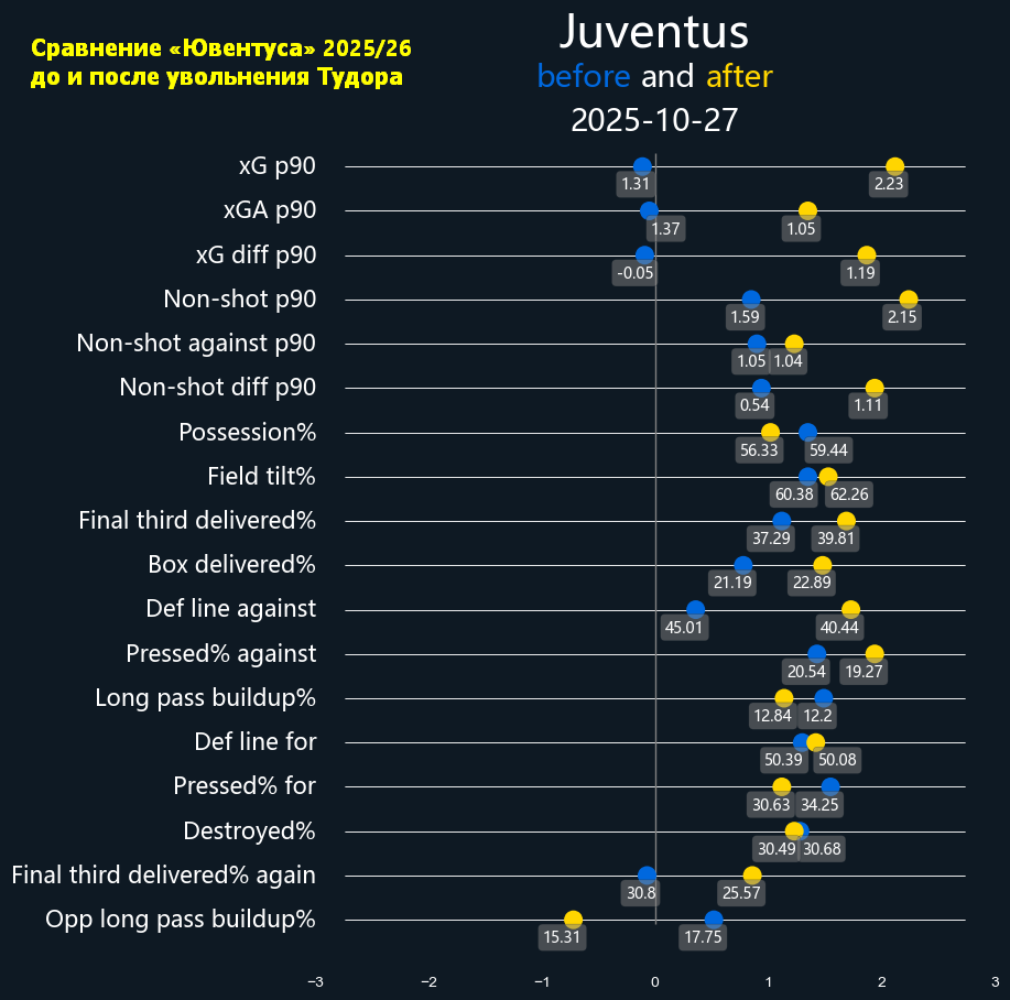 Цепляясь за позитив, можно было бы порассуждать о решении Тудором проблемы моментов, допускаемых в коротких переходах владений, — при Франке она остро стояла, что разбирали в том числе на примере матча с "Челси". В случае с "Лацио" он сразу достаточно радикально упростил игру — и нечто похожее было и в конце прошлого сезона с "Юве" (например, на его отрезке коротко разыгрывалось менее 50% ударов от ворот). Но это не очень вяжется ни с итогами конкретного матча (у "Арсенала" 11 возвратов внутри финальной трети, два из которых были доведены до удара), ни с наиболее актуальной информацией по "Ювентусу", где после начала сезона 2025/26 и до увольнения доля коротко разыгрываемых ударов от ворот сильно увеличилась (до 70,7%), а показатель допускаемых с потерь внутри своей трети ударов составил 1,36 на 90 минут, хуже только у шести команд (это не катастрофический, но и не хороший или даже средний результат).