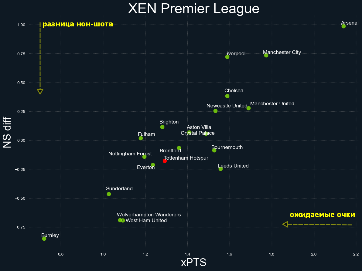 Теперь взглянем на график с ожидаемыми очками и разницей нон-шота по АПЛ 2025/26: