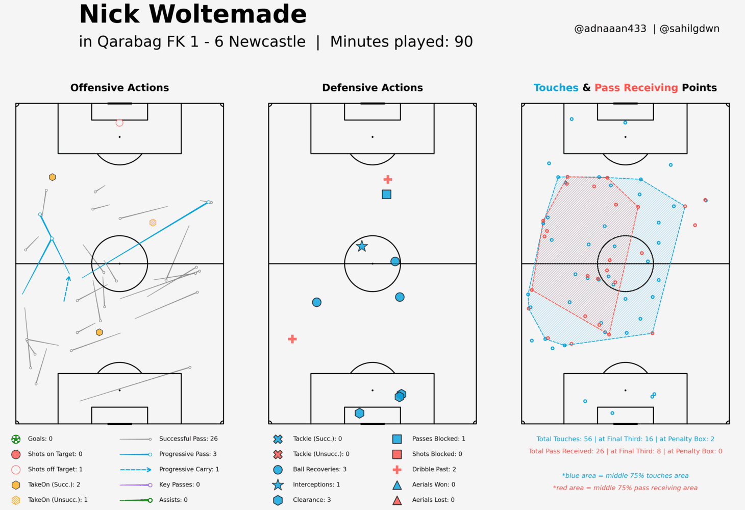 За эти 45 минут, в которые и решился исход всей серии, немец получил восемь передач, чаще всего — от Тонали. "Ньюкасл" не испытывал каких-то проблем с выходом из обороны, Поуп редко закидывал чужую половину длинными мячами, а в целом многое строилось вокруг контрпрессинга и давления в средней трети и выше. Интересно, что из семи высоких возвратов у "сорок" шесть пришлись на центр и левый фланг — зоны, в которых действовал Вольтемаде (но непосредственно вынуждали ошибаться хозяев другие игроки "Ньюкасла", стоит это отметить).