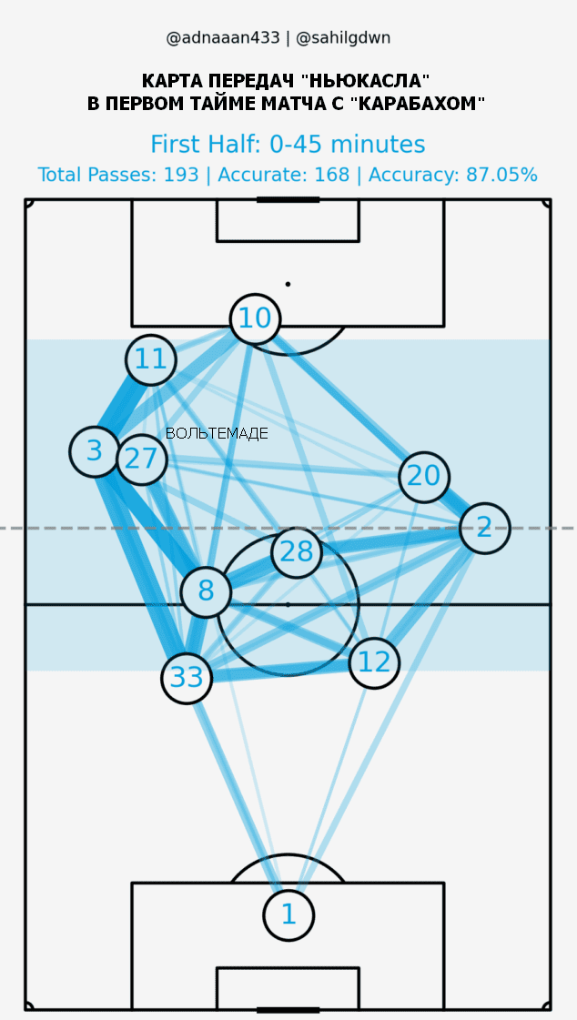 Календарь был сложным — в контексте силы соперников — и насыщенным в принципе, как вы можете понять по числу встреч. И это на фоне кадровых проблем в полузащите (минус Гимараэс и Жоэлинтон). Против "Карабаха" Хау использовал вариант 4-2-3-1, где фактически в центре полузащиты были задействованы игроки группы нападения — Вольтемаде вышел как "десятка", а Уиллок — в качестве второго опорного. Карта передач после первого тайма отлично иллюстрирует схему "Ньюкасла":