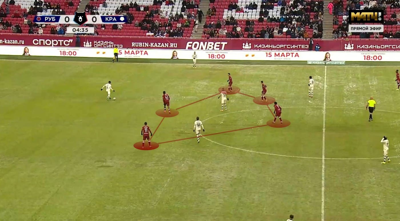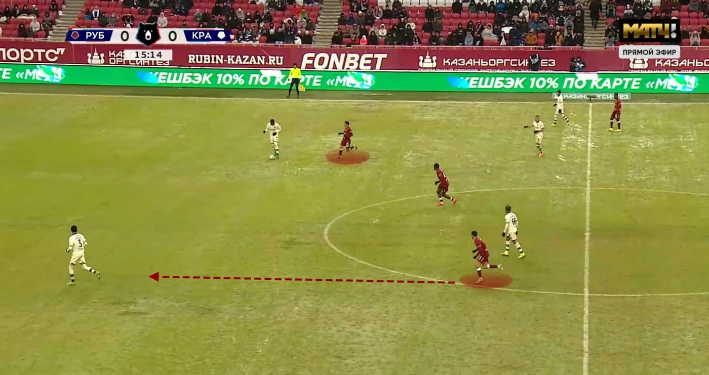 У "Краснодара" же привычная структура позиционного розыгрыша сталкивалась с плотной обороной соперника. Сперцян регулярно отваливался в левый фланг для получения мяча — именно этот механизм отмечался как один из ключевых в разборе игры "быков", но группа атаки казанцев выстраивалась в ромб и перекрывала эту опцию.