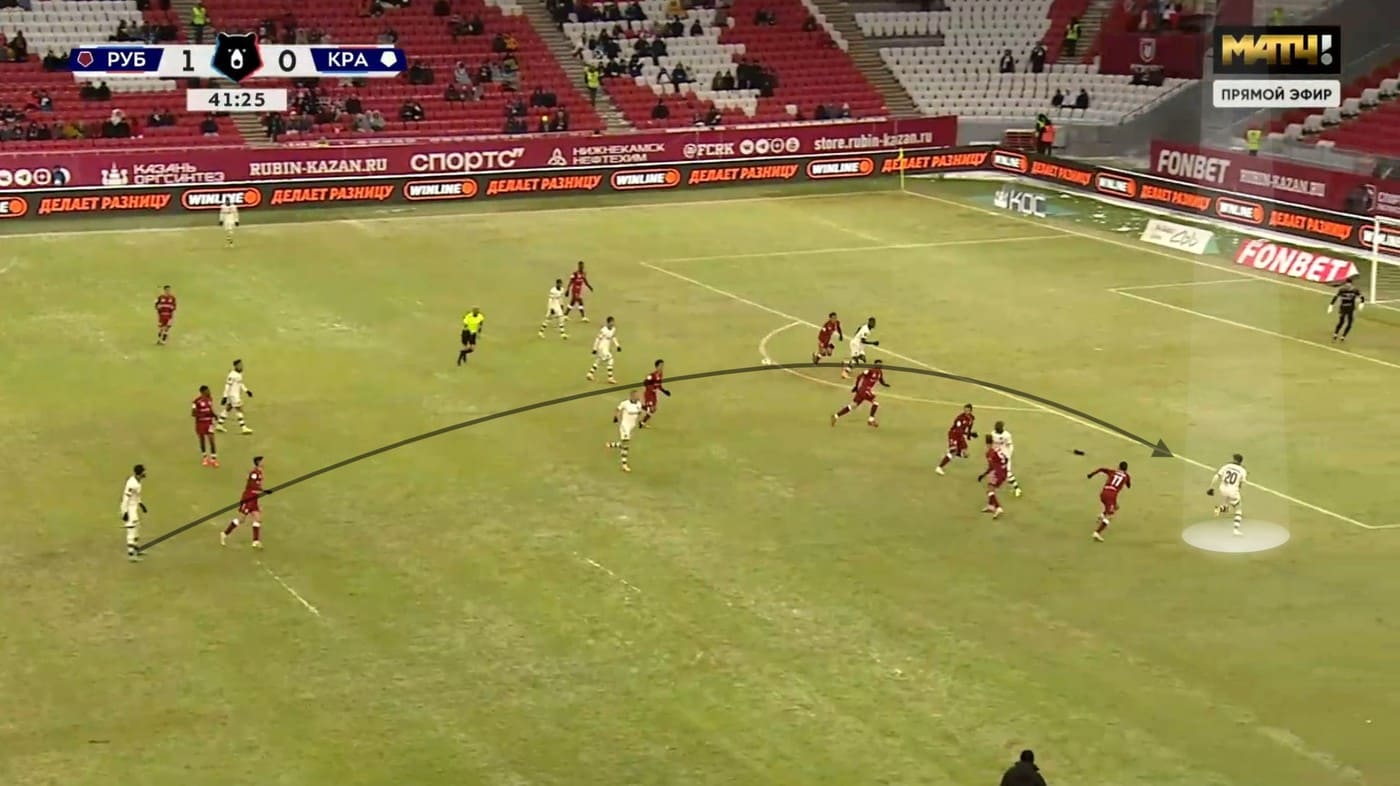 Гол "Краснодара" стал одной из немногих действительно качественных комбинаций гостей в этом матче. Эпизод начался с перегруза правого фланга обороны "Рубина": сначала рывок Эльдара Гусейнова открыл линию передачи на Сперцяна, а затем численное преимущество усилил Боселли, вышедший номинальным правым нападающим.