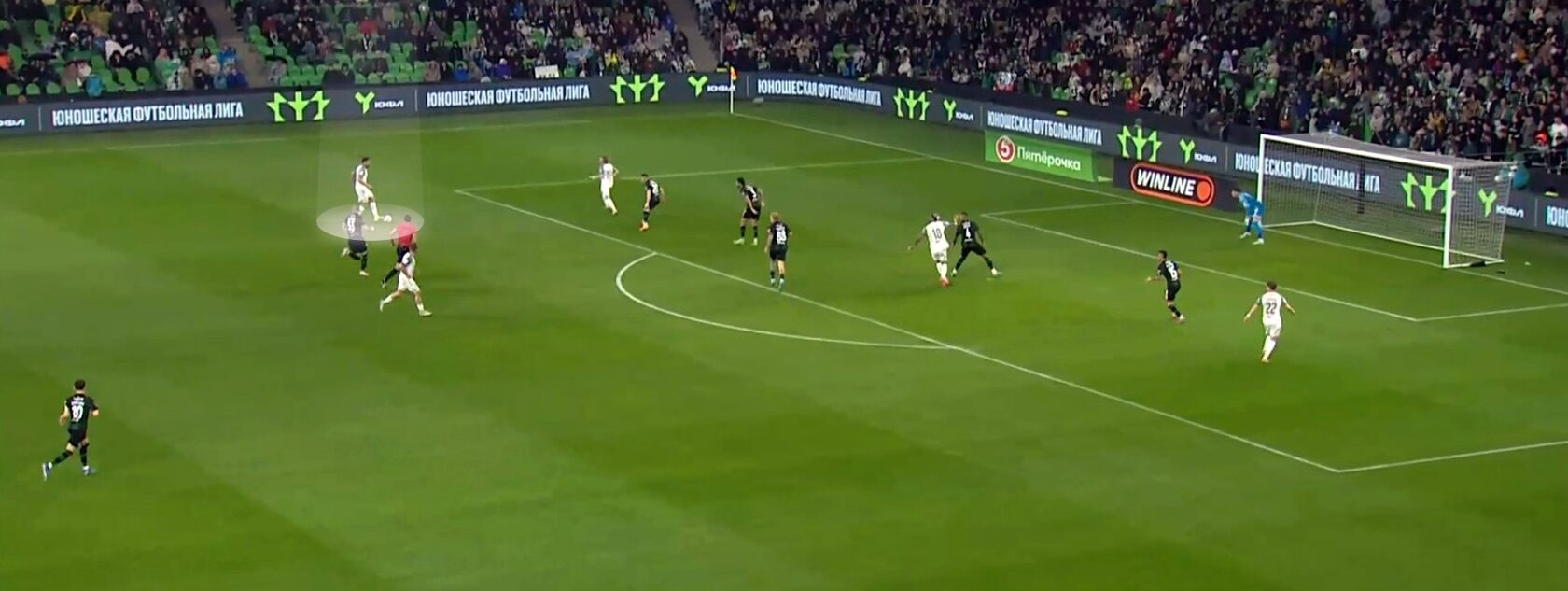 Нетипичное расположение Кордобы (не успел вернуться в центр после предыдущего эпизода), разбалансированная из-за этого позиция внешних центральных защитников ("выдвигаться к Кривцову и Сперцяну или оставить пространство?") и недостаточно узкое расположение тройки атакующих сделали эту расчерченную комбинацию через центральную зону голевой.