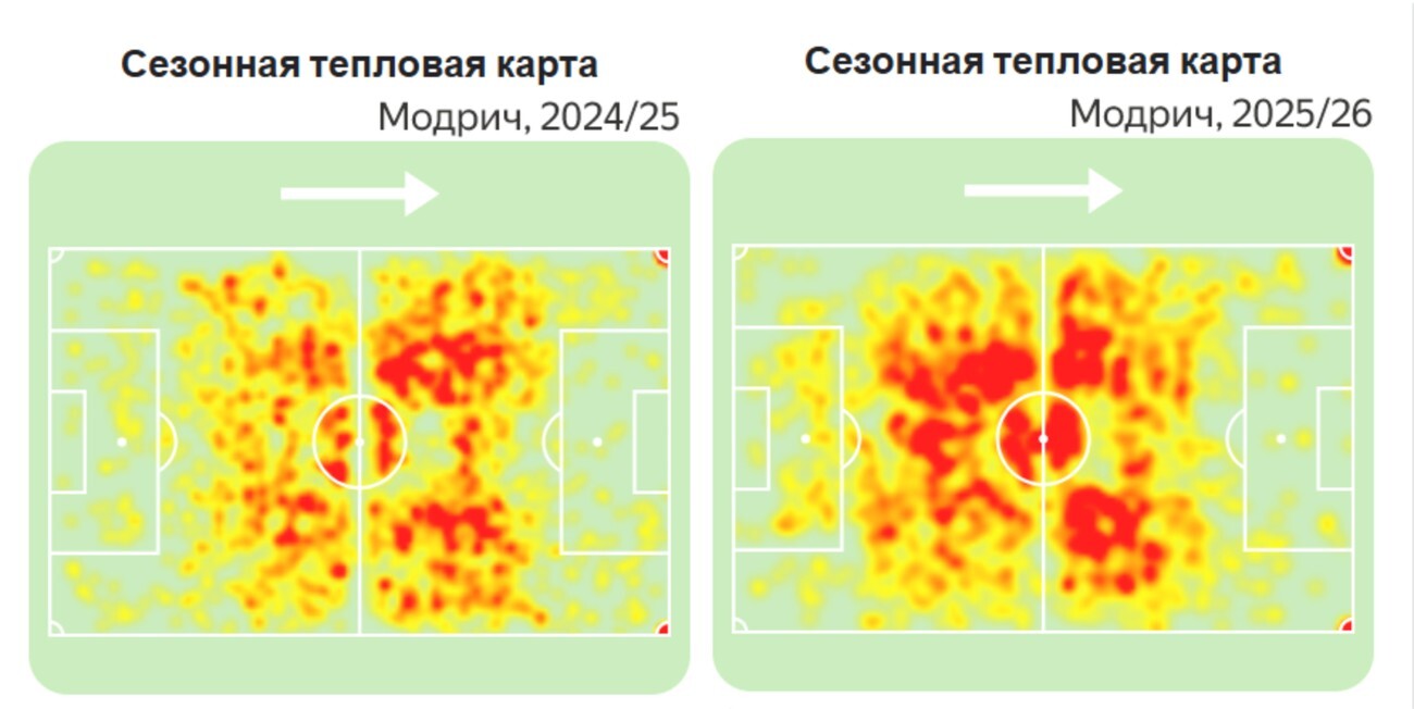 Многие видели статистику, согласно которой Модрич входит в топ-3 лиги по показателю возвратов (или начатых) владений. Она, безусловно, занятна. Но, опять же, диктуется сдержанным стилем игры без мяча. За счет своего богатейшего опыта Лука грамотно выбирает позицию. Обратите внимание на его тепловые карты по двум последним сезонам: прошлому в "Реал" и нынешнему в "Милане". Очевидно, что хорватский ветеран действует глубже — как с мячом, так и без него.