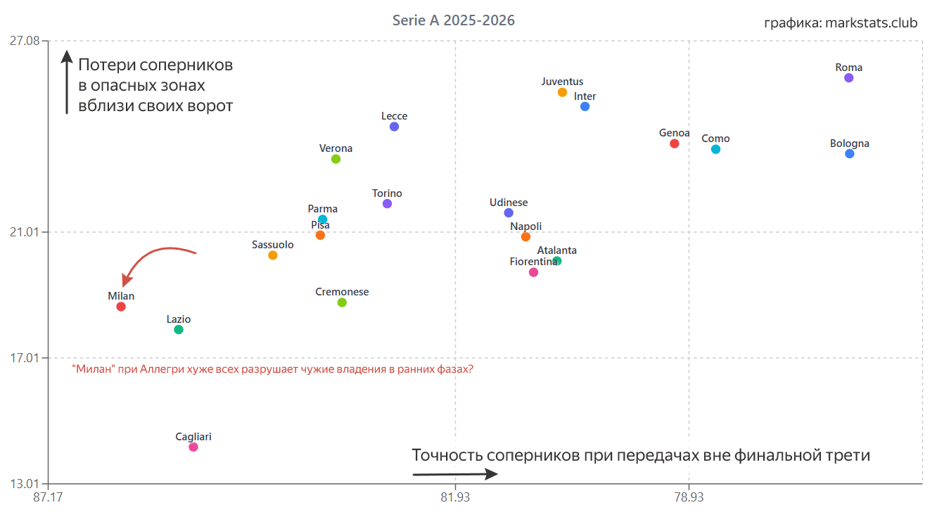 Соперникам "Милана" проще остальных в Серии А выходить в атаку из билдапа. Статистика от markstats.club (график ниже) говорит: точность оппонентов россонери в этой фазе владений составляет 86%. Для сравнения, у "Ромы" Гасперини и "Болоньи" Итальяно — по 77%. Таким образом, можно отчасти сделать вывод: "Милан" при Аллегри хуже всех разрушает чужие владения в ранних фазах.