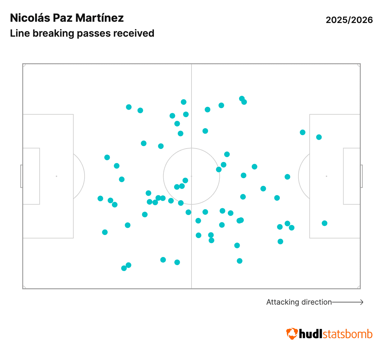 Используя метрики Statsbomb 360, можно получить более полное представление об этом аспекте игры Паса. Примечательно не только то, сколько передач он получает, но и то, в каких ситуациях и где на поле это происходит. Нико занимает второе место в Серии А по числу принятых передач "сквозь" чужие оборонительные линии на расстояние не менее пяти метров, что демонстрирует его способность находить свободные зоны между линиями и грамотно выбирать позиции для продвижения мяча.
