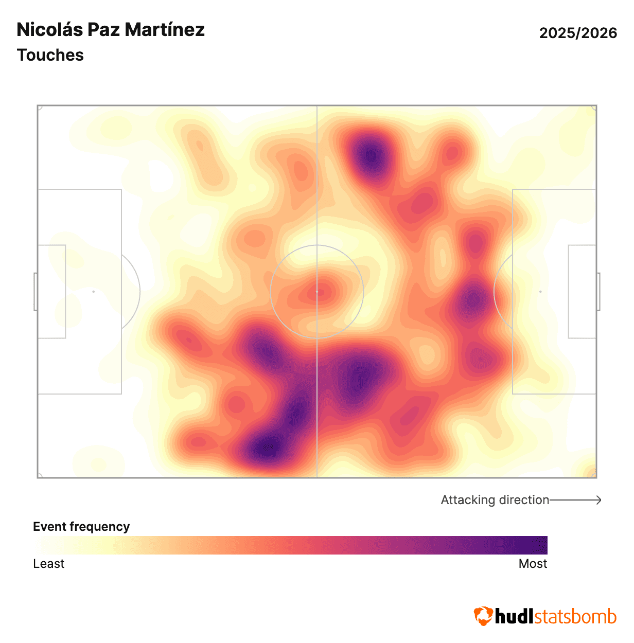 Несмотря на то, что ему всего 20 лет, бывший игрок "Реала" уже является универсальным хавбеком — он воплощает аргентинский идеал десятого номера, энганче: не современный треквартиста, который решает исход матча в финальной трети, а футболист, который может сыграть в любой зоне поля и решить, в каком направлении будет развиваться игра. Его тепловая карта это подтверждает.