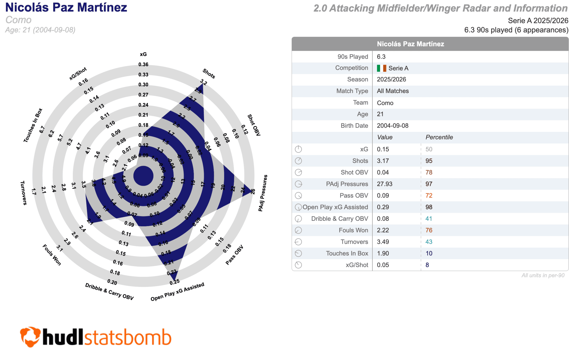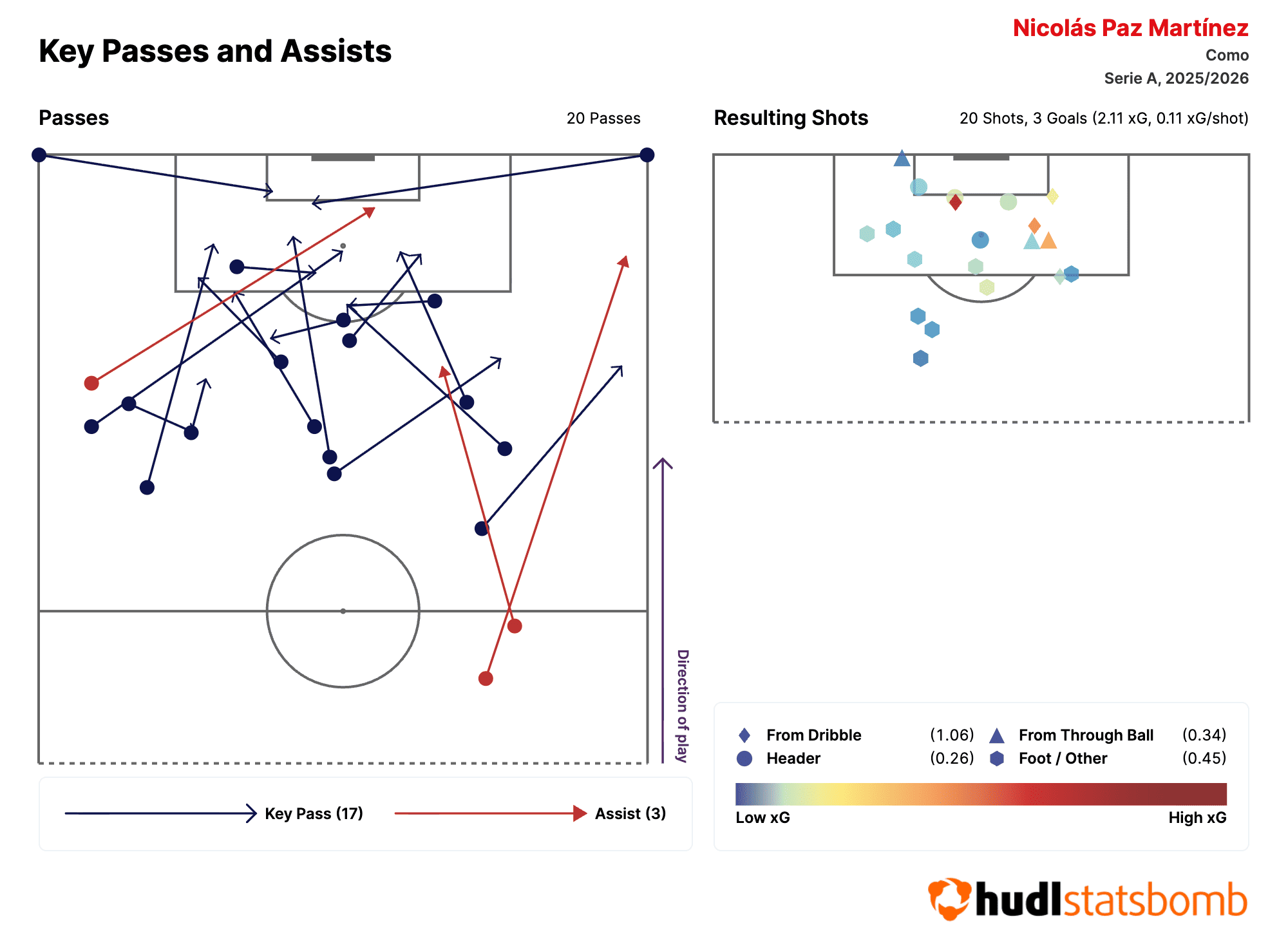 Чтобы показать, насколько велико его влияние на игру и на его товарищей по команде, отметим, что среди всех атакующих игроков Серии А, сыгравших более 90 минут в первых шести матчах, Нико Пас занимает второе место по количеству полученных передач: 32,54 в среднем за игру.