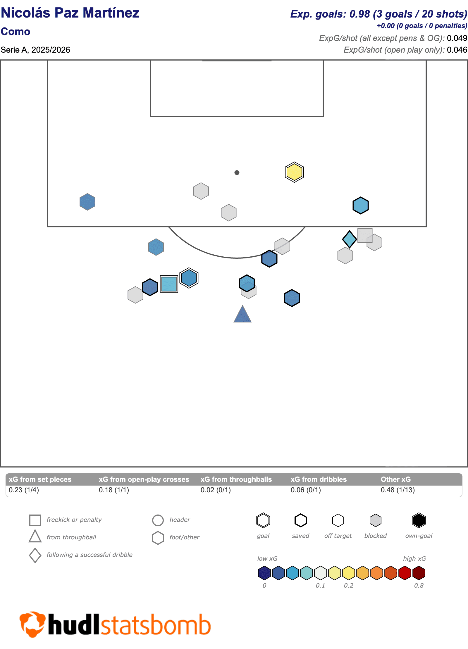 Удары Нико Паса на старте сезона в Серии А (у него почти нет явных голевых моментов), два мяча из трех забиты после попыток из-за штрафной