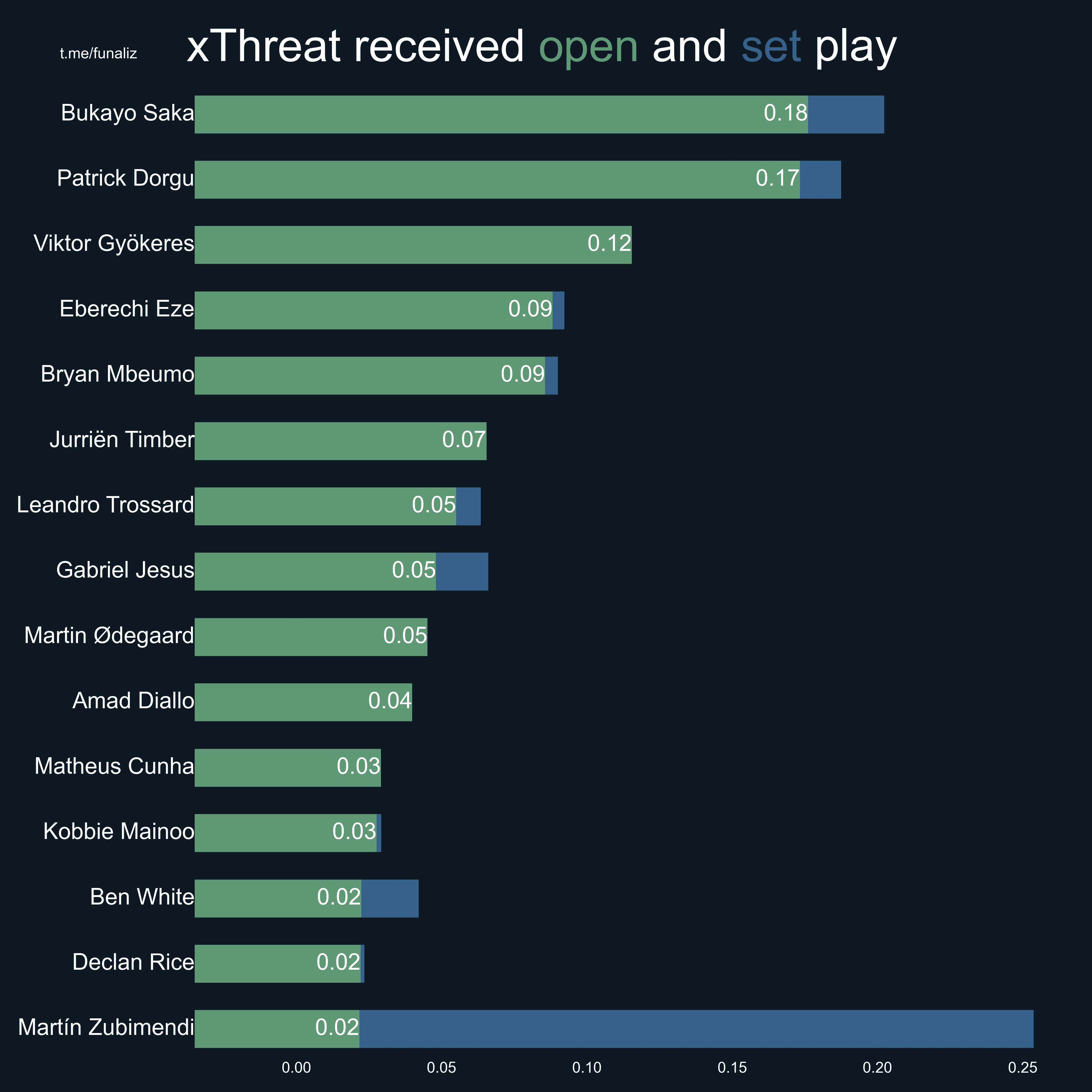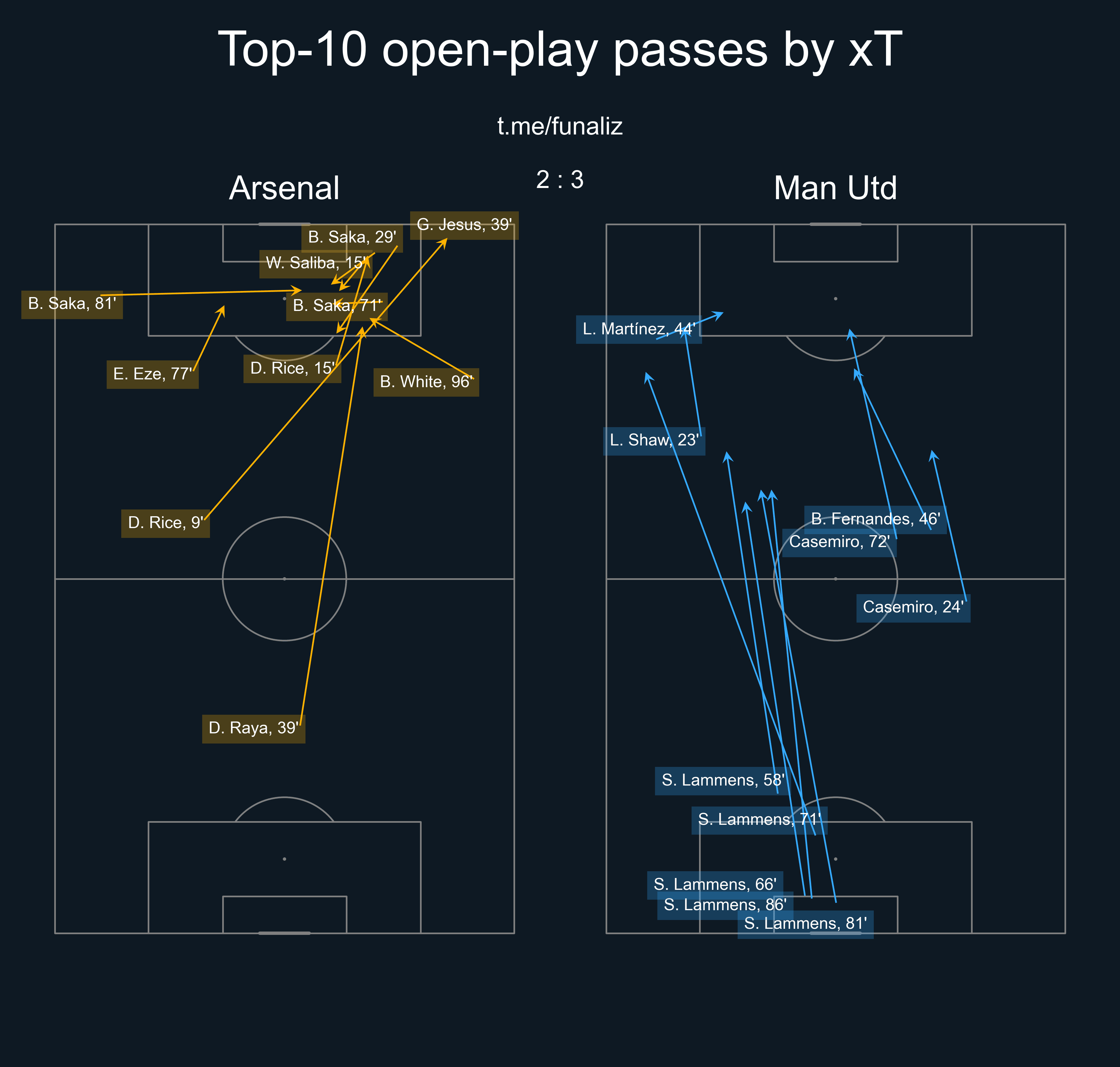 Впрочем, говоря о владениях "Юнайтед", стоит отметить и вклад Мартинеса, который стал лучшим среди полевых по объему передач с продвижением (7). Звучит занятно, учитывая, насколько непросто было гостям в принципе переходить через среднюю линию поля в "спокойном" режиме. Но именно работа аргентинца позволяла делать это в ситуациях, когда "Арсенал" плохо контролировал полуфланг в среднем (и чуть глубже) блоке. Так родился эпизод с голом Доргу, который, впрочем, был не единственным у "МЮ".
