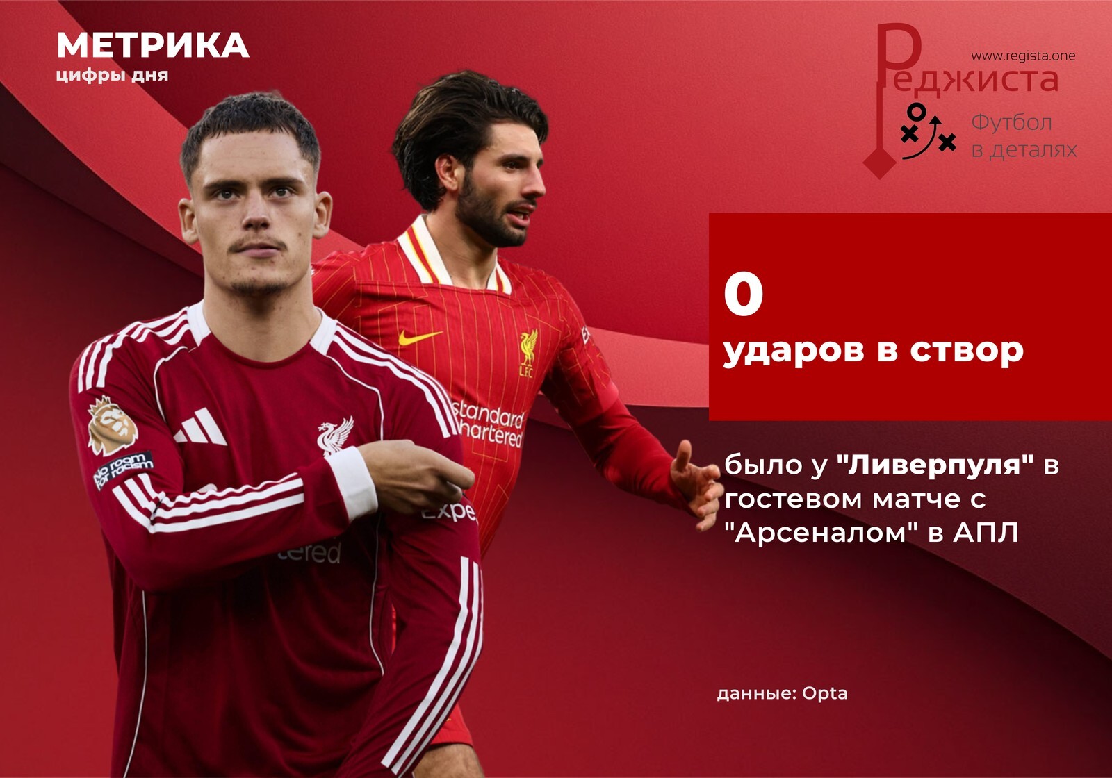Слот после матча пожаловался на проблемы "Ливерпуля" со взломом низкого блока соперников, Артета лишний раз указал на антирекорд соперника, связанный с отсутствием ударов в створ. Впрочем, первый (и последний) биг-шанс "Арсенала" возник на 96-й минуте — на угловом, когда Габриэль пробил мимо ворот. Нули здесь абсолютно заслуженные.