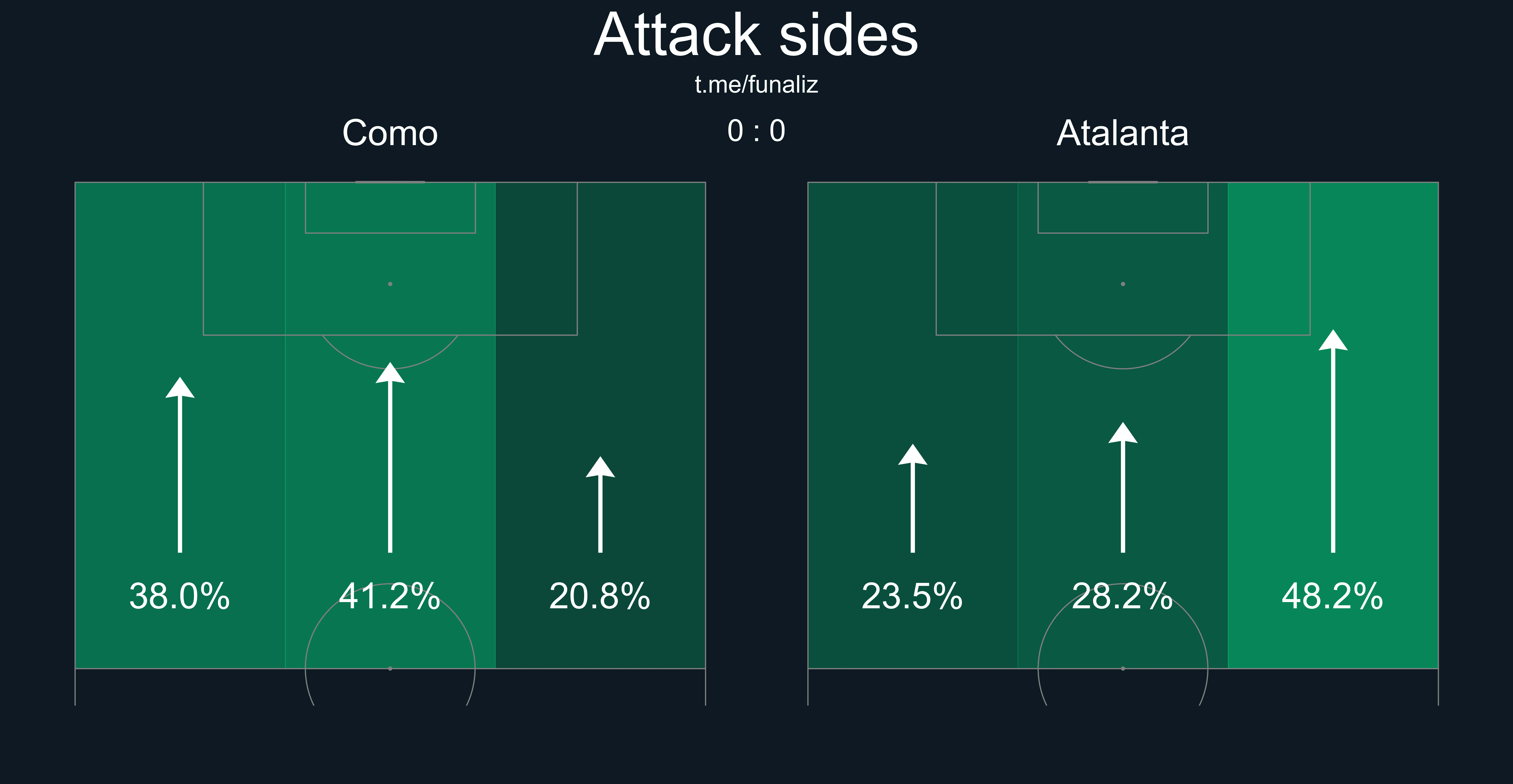 Оставшись очень быстро в меньшинстве, бергамаски выбрали наиболее очевидный для себя вариант — терпеть. "Комо", и без того практически чаще остальных в лиге атакующий через центр, чувствовал себя хорошо в этих условиях. "Аталанта" выбрала в качестве ориентира не пространство, а конкретных исполнителей (Скальвини играл по Пасу персонально, например). Команда Фабрегаса совершила 74(!) передачи в зоне 14, семь из них — под удар. Особенно много "Аталанта" позволяла перед собственной штрафной во втором тайме, когда объем таких передач у хозяев вырос вдвое. На центр у них в итоге пришлось больше атакующих действий, чем на любой из флангов.