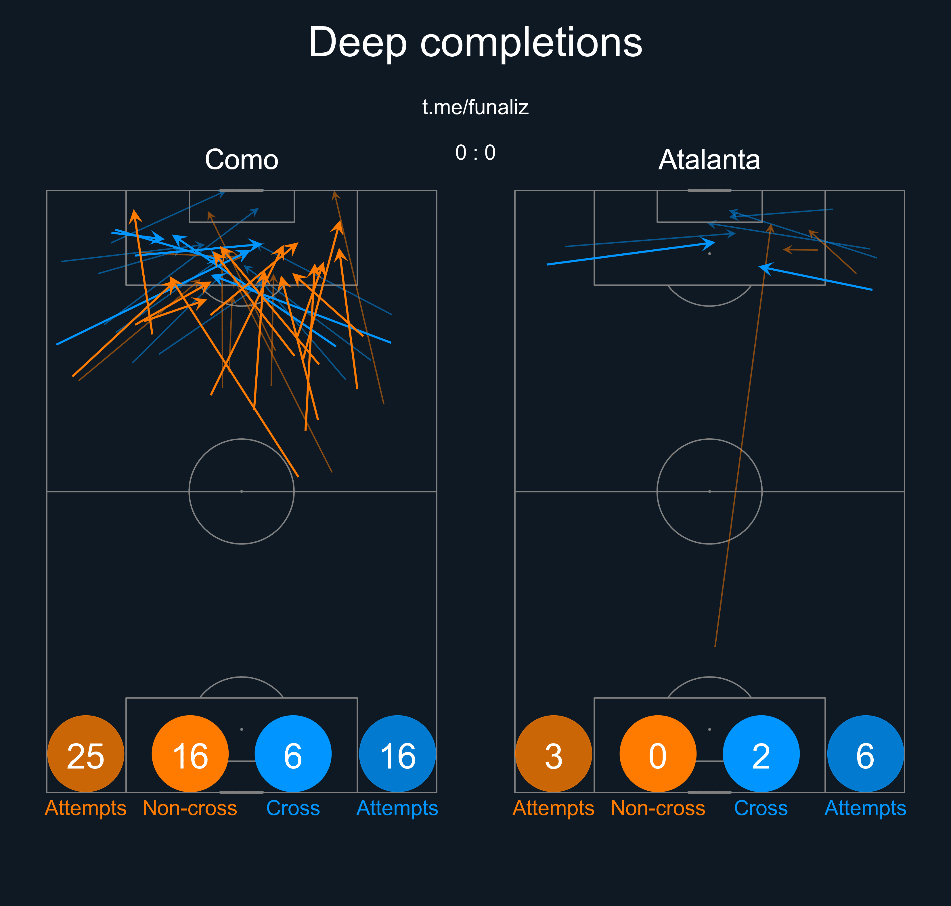 На фоне 12 биг-шансов, которые "Комо" имел в матче с "Аталантой" (вылилось в 4-6 xG в зависимости от того, каким источником вы пользуетесь), немного в тень ушла шикарная статистика проникновений в опасный радиус. Шесть через кроссы и 16 с помощью передач — большой показатель даже по меркам матча такого характера, при котором футболисты "Комо" провели практически всю игру на чужой половине поля.