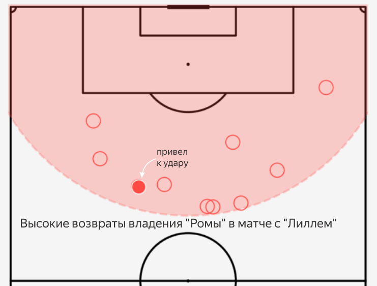 Другой аспект — конвертация высоких возвратов владений. "Рома" едва ли не активнее всех в лиге использует контрпрессинг на чужой половине поля, но при 42 высоких возвратах только четыре довела до ударов (один гол). В матче с "Лиллем", по разным оценкам, у столичных было между 10 и 14 таких возвратов (один удар):
