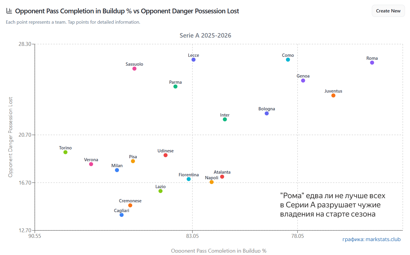 Проблему усиливает и эффективность в билдапе — в среднем за матч всего один выход из обороны через пас "Рома" доводит до удара. Это почти втрое меньше, чем у нынешней "Аталанты".