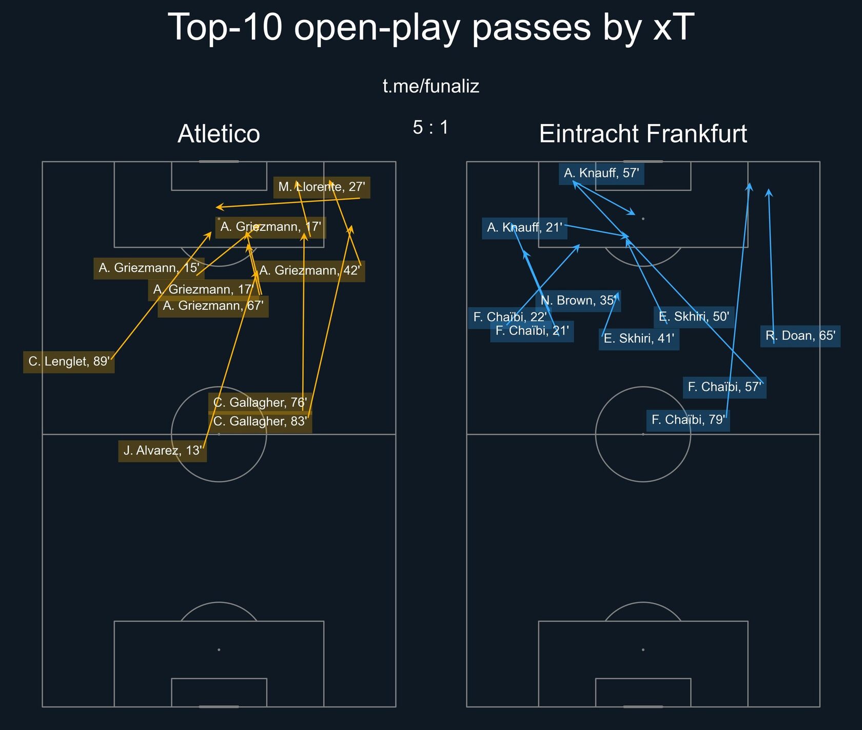 Вариант впереди против "Айнтрахта" был более легковесным, чем на "Реал", но мы видели и те же кроссы (прежде всего от крайних защитников), и насыщение проекции створа, и стремление создавать проблемы сопернику из зоны 14 перед его штрафной. "Атлетико" же, как и в матче с "Реалом", забивал из различных ситуаций: стандартные положения (Ле Норманд отличился в обеих встречах), с игры, после быстрого перехода, а также с пенальти.