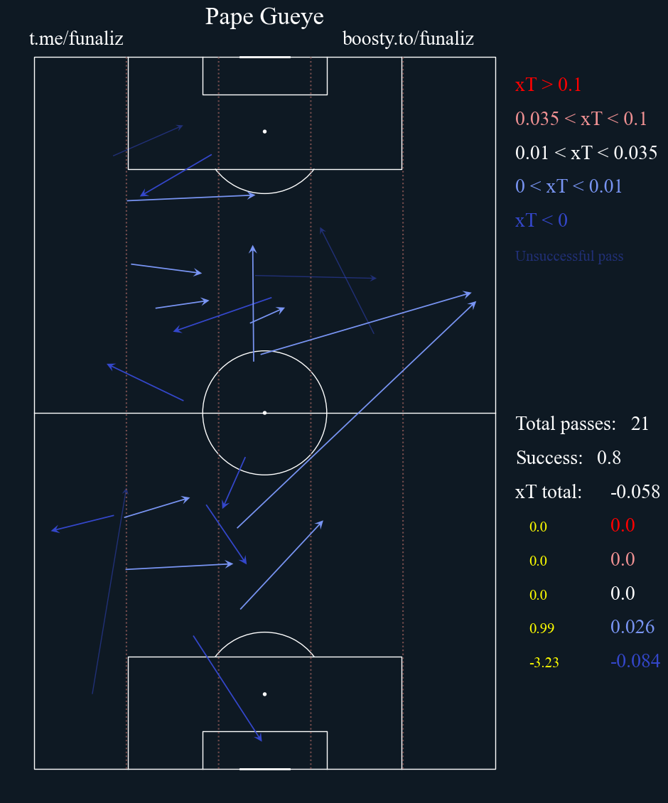 Однако в прошлом сезоне это было скорее "во имя угрозы через центр и полуфланги" — у "Вильярреала" вторая доля в лиге по проникновениям в штрафную через центр за сезон 2024/25 (54,7%, только у "Барселоны" выше). И в случае с Гейе жертва получается "в никуда". Правда, что в прошлом сезоне у него были сильные — по меркам своей позиции — цифры по дриблингу/ведениям и весьма агрессивный пасовый профиль (средняя "сложность" его передач выше, чем у 90% коллег по амплуа), однако это не означает, что такой игрок, оказавшись в роли номинального вингера, обязательно будет много обыгрывать или искать партнеров между линиями, а также открываться там сам, либо создавать много остроты через кроссы.