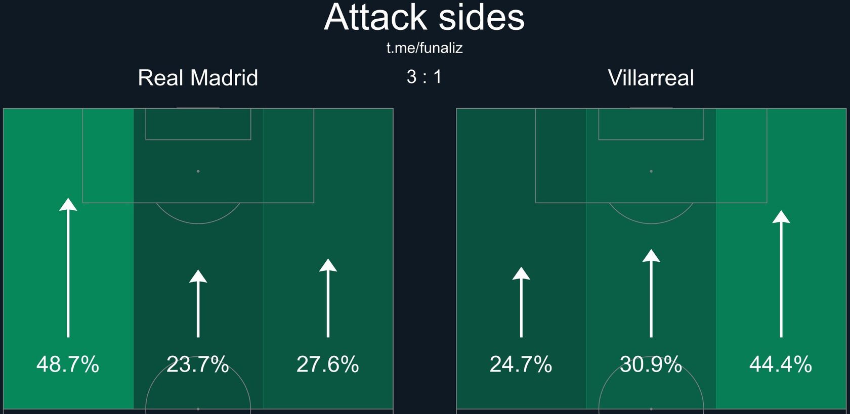 Но понятно, что даже с такими ходами "Вильярреал" не превращается в неуязвимую (на флангах) без мяча команду. С "Реалом" это усугубилось не только наличием Мбаппе и Винисиуса, часто встречающихся с мячом в ширине, но и ранними желтыми крайних защитников — Кардоны (12 минута) и Моуриньо (21 минута).