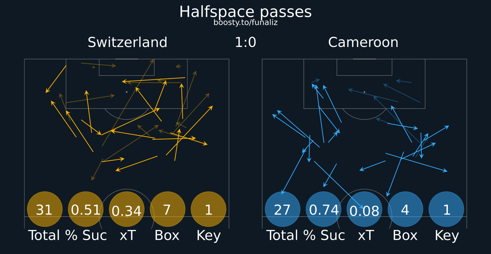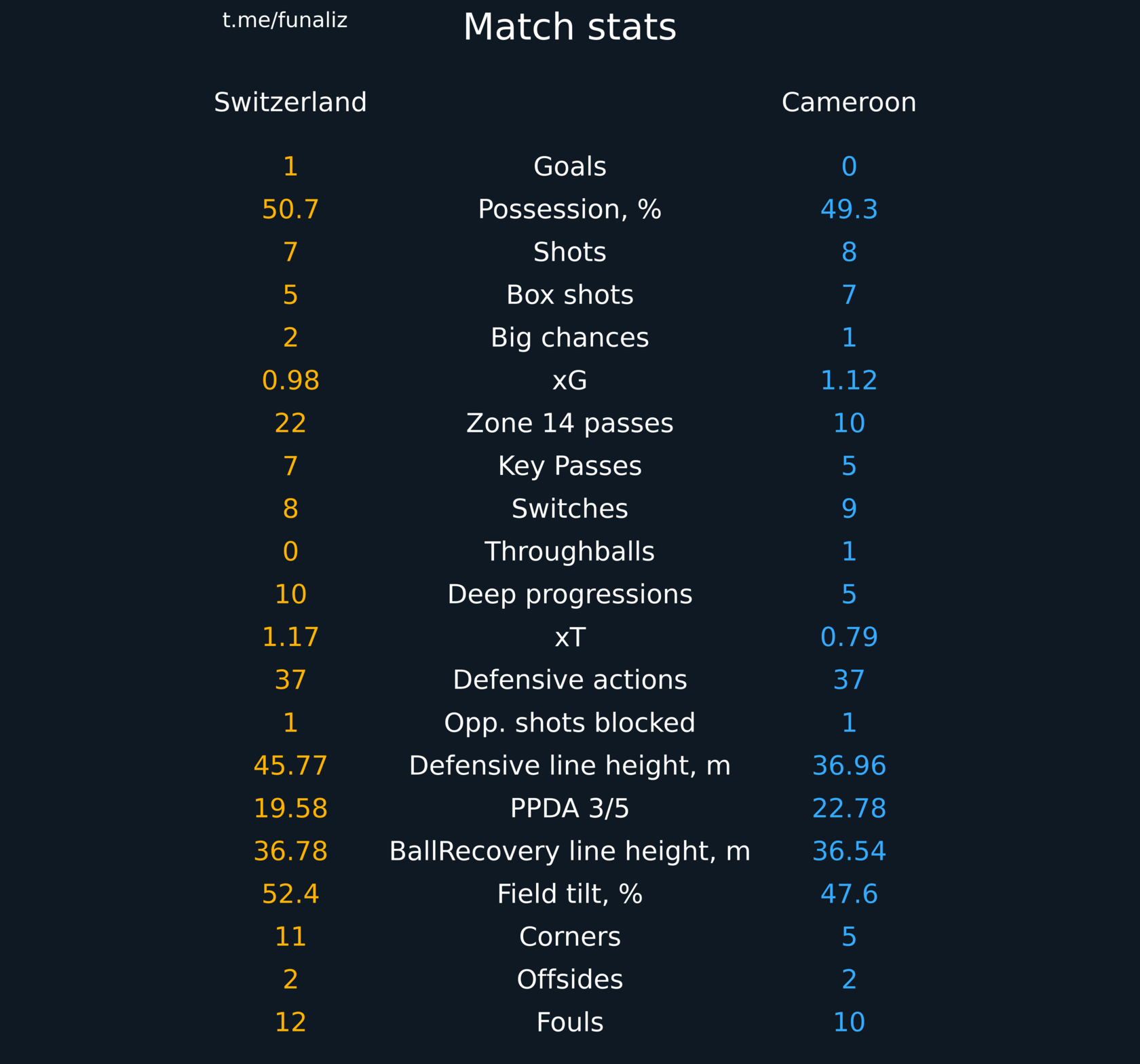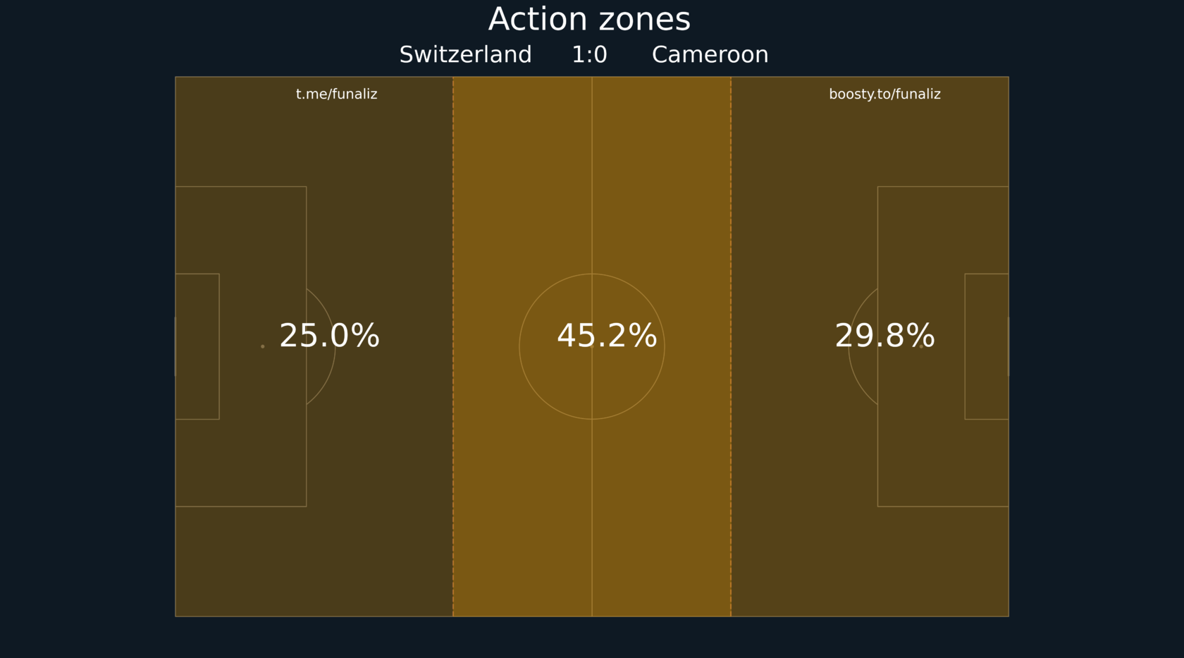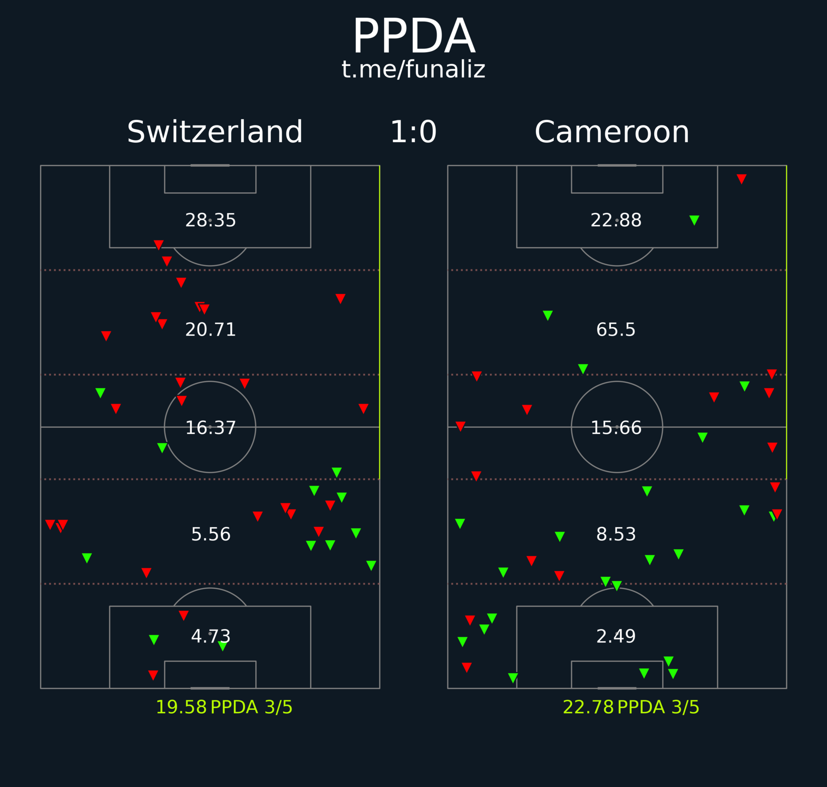 Карта передач Статистика "Ценность" ударов и ожидаемые голы Зоны действий Направления атак Тепловая карта подборов мяча Наиболее популярные попытки проникнуть в среднюю и финальную треть Ведения, закончившиеся в радиусе 20 метров от ворот соперника Точные пасы в радиус 20 метров от ворот соперника Тепловая карта оборонительных действий Отношение дистанции, на которую ведение продвигает мяч к воротам, к изначальному расстоянию мяча от ворот Территориальное доминирование Передачи из полуфлангов и их "опасность" Число передач на оборонительное действие соперника Переключения Самые "опасные" передачи Ожидаемая угроза Передачи в зону 14 и из нее