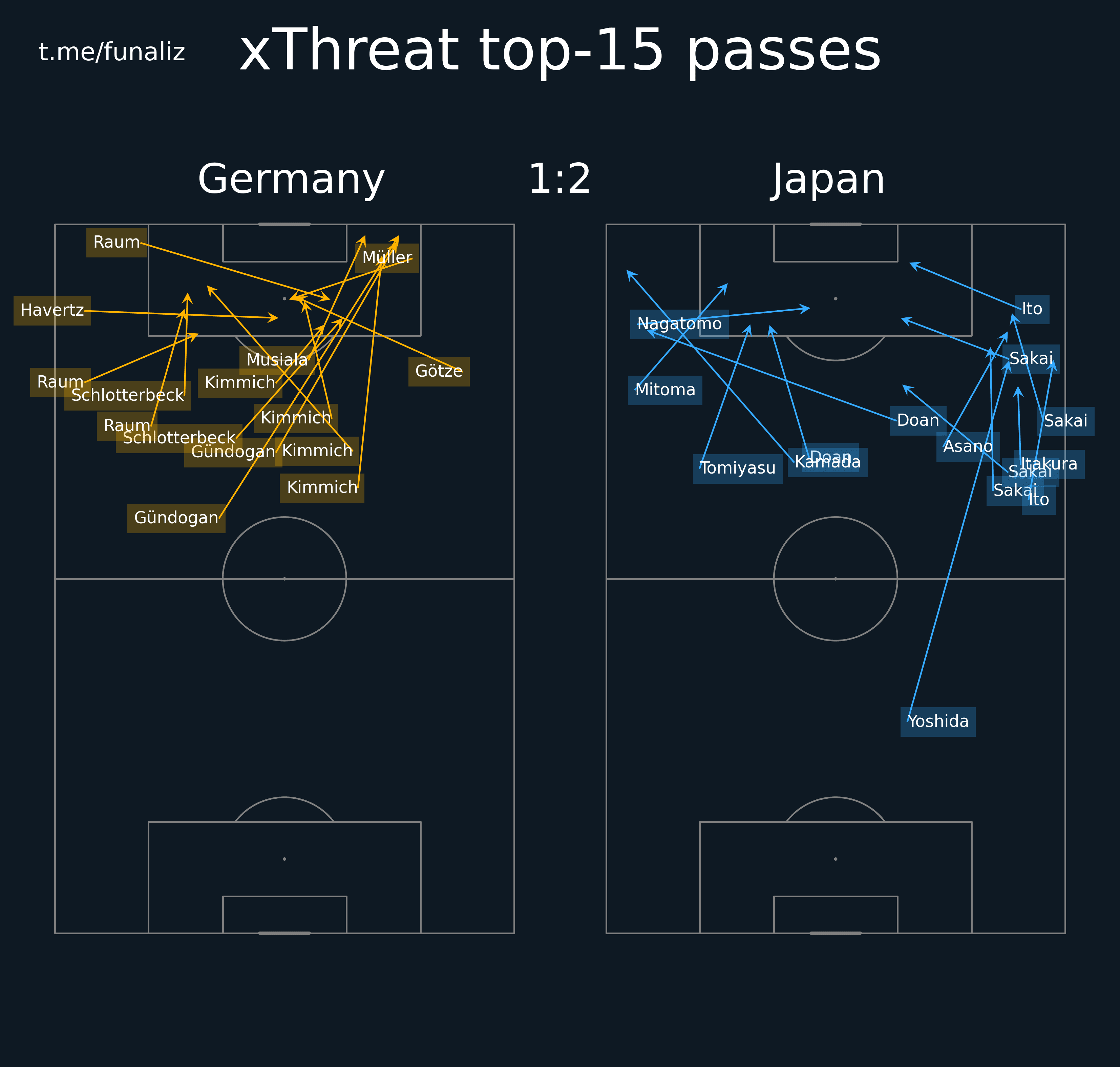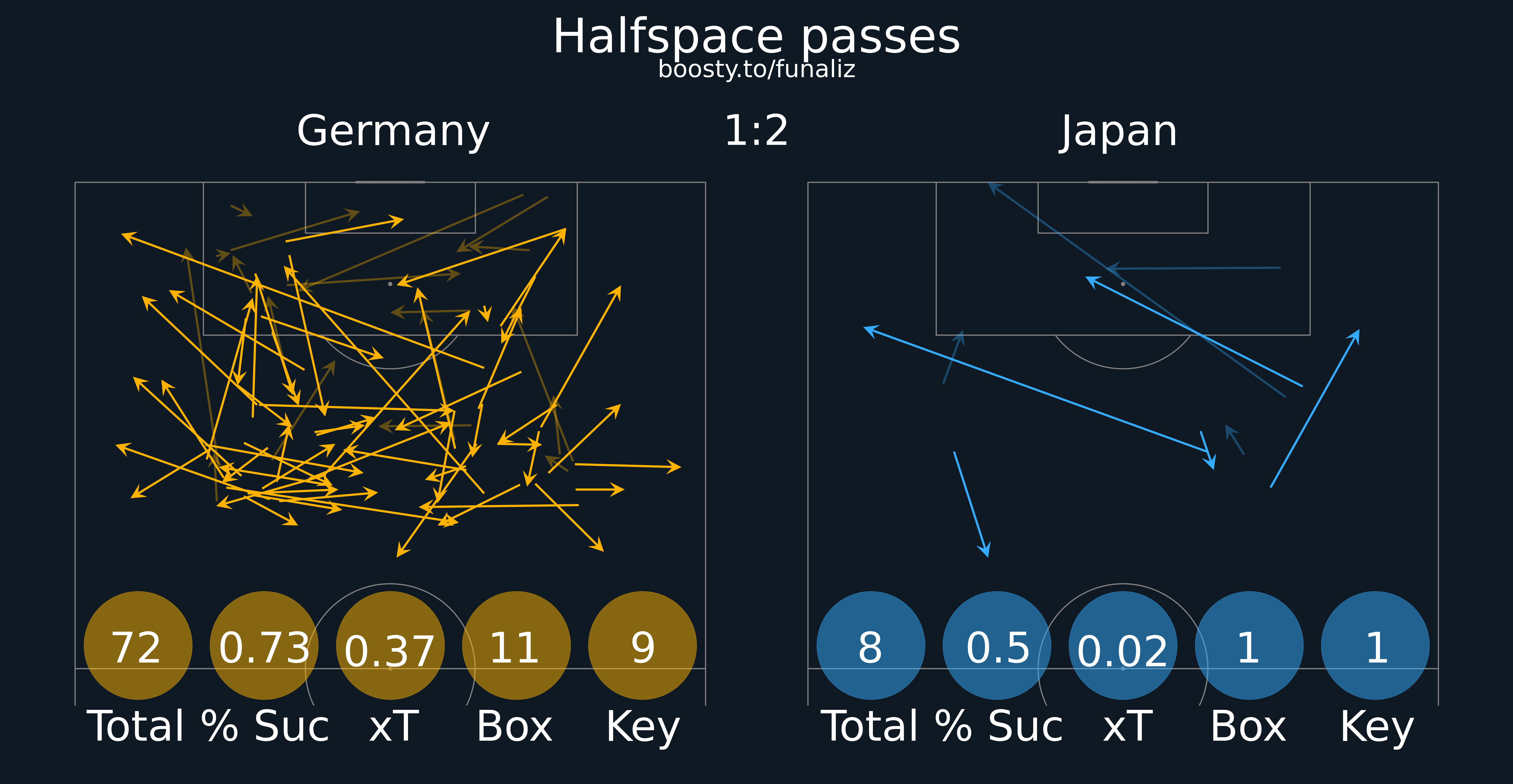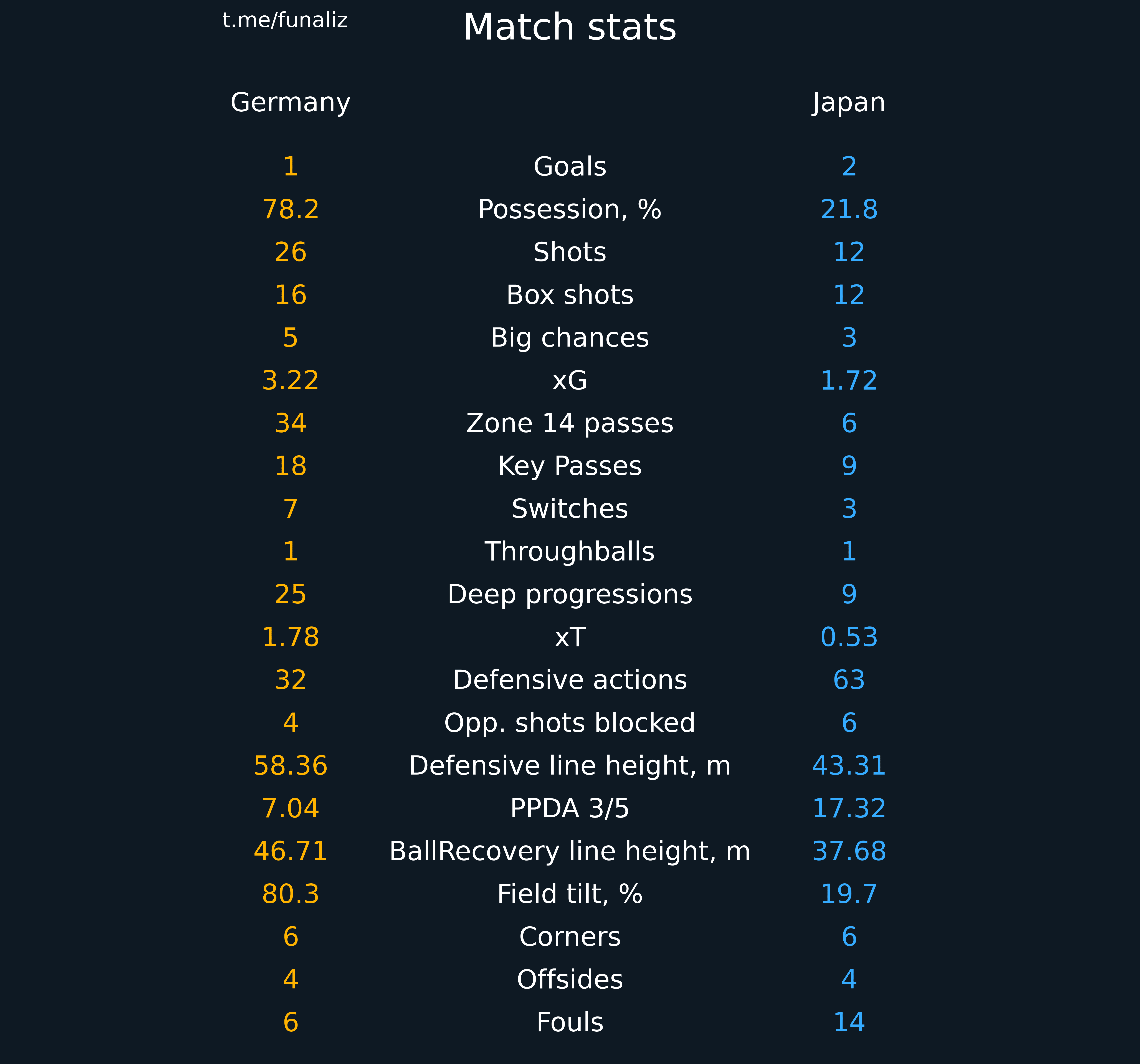 Карта передач (до первой замены в матче) Статистика "Ценность" ударов и ожидаемые голы Зоны действий Направления атак Тепловая карта подборов мяча Наиболее популярные попытки проникнуть в среднюю и финальную треть Ведения, закончившиеся в радиусе 20 метров от ворот соперника Точные пасы в радиус 20 метров от ворот соперника Тепловая карта оборонительных действий Отношение дистанции, на которую ведение продвигает мяч к воротам, к изначальному расстоянию мяча от ворот Территориальное доминирование Передачи из полуфлангов и их "опасность" Число передач на оборонительное действие соперника Переключения Самые "опасные" передачи Ожидаемая угроза Передачи в зону 14 и из нее